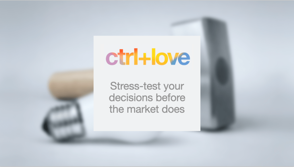 Stress-test your decisions with ctrl+love. Built from 60+ handcrafted personas, divided into two teams: ctrl+love protects the idea. cmd+hmm challenges it against reality.
